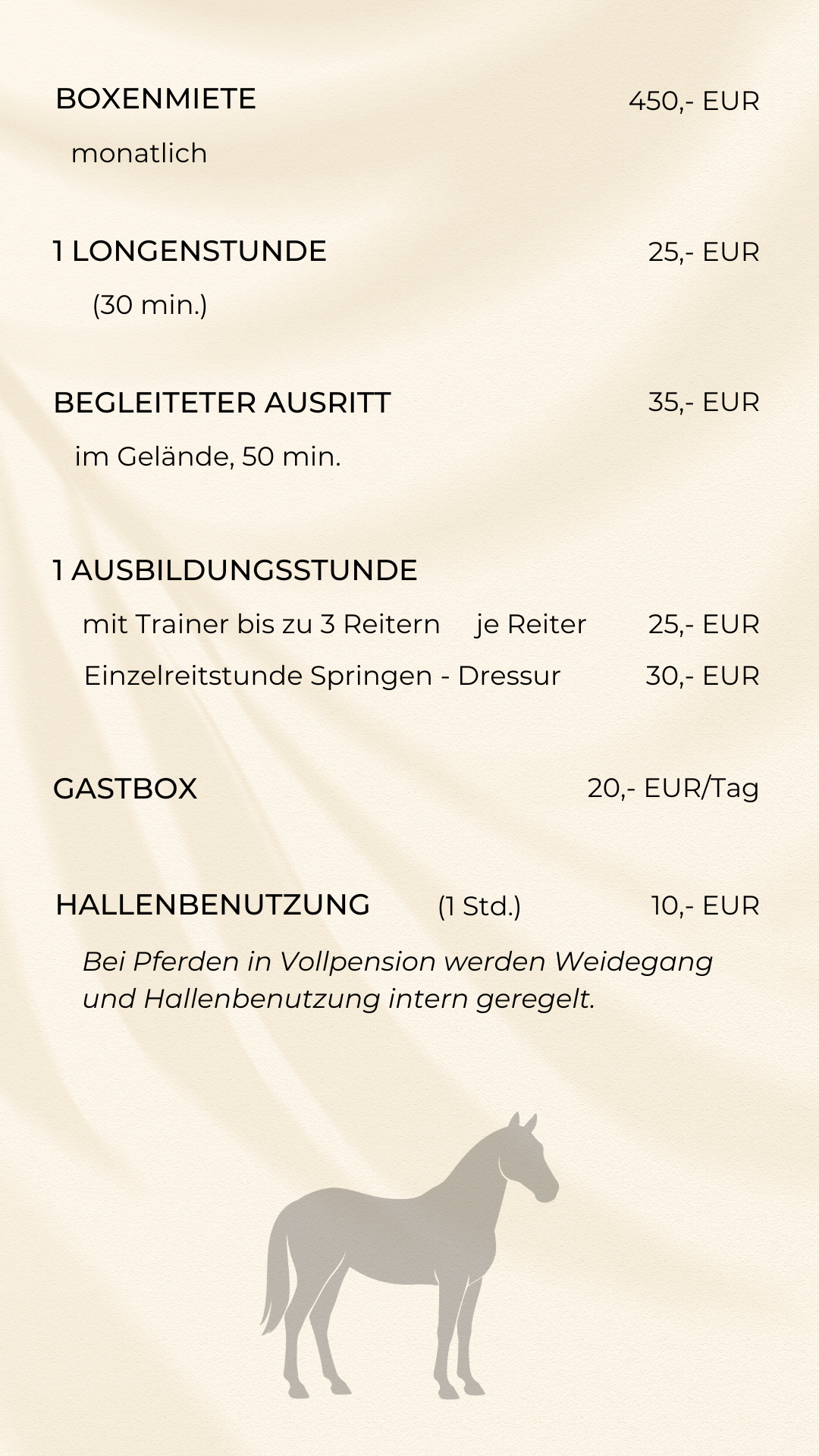Unsere geräumigen und gut ausgestatteten Pensionsboxen bieten höchsten Komfort und eine optimale Versorgung. Neben regelmäßiger Fütterung und Misten erhalten die Pferde Zugang zu großzügigen Weideflächen und viel Bewegung an der frischen Luft.